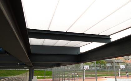 Different types of roof were used, according to the needs of each space, and cover blocks E, F, G and H, as well as the recreation grounds which exist between the different blocks and pitches. For the roofs, we used different types of cladding: metal sheets, double metal sheets intercalated with rock wool, hollowcore planks and deck type cladding. On a structural level, we built the pitch, block E’s technical floor, as well, as the passageways which connect the different blocks. Both mixed slabs and fence panel were applied.